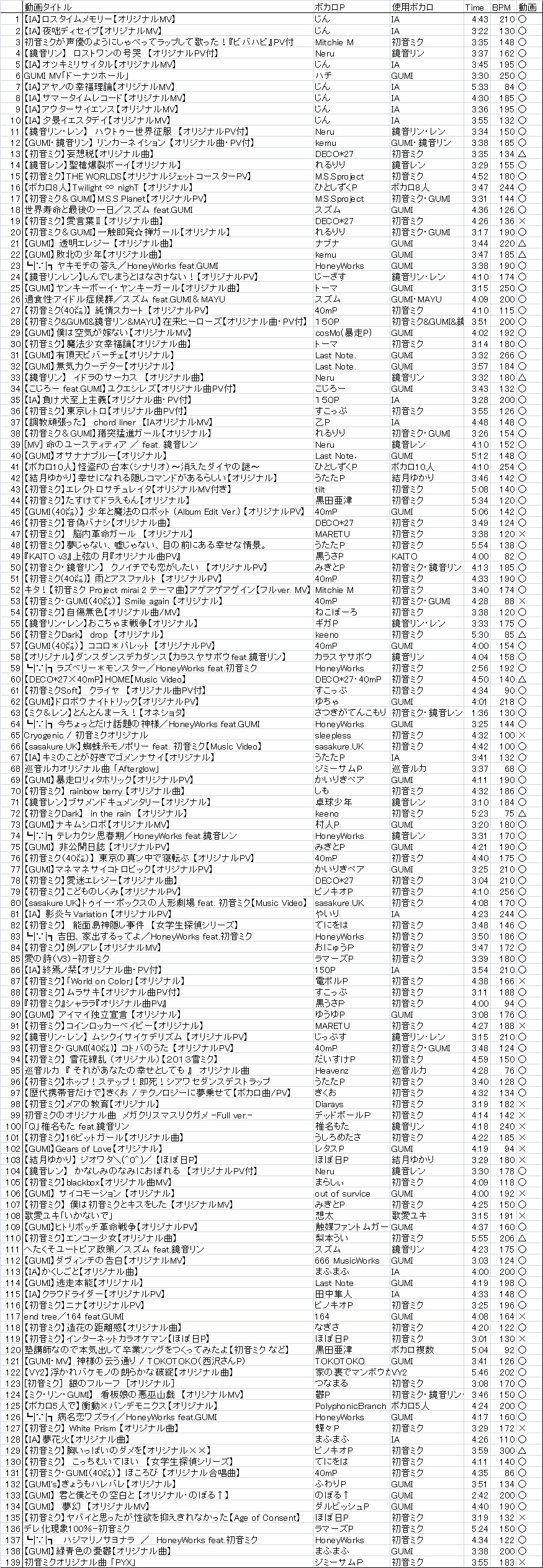 かねがね言われている事ですが、やはりボカロック路線の人気は磐石。ロックに分類したものだけでも60本、ポップ・ロックまで含めれば81本と、全体の60パーセント越えという圧倒的な数字です。クラブミュージック系の楽曲も頑張っていますが、この中にハウスからドラムンベースまで、様々なビート、BPMのクラブサウンドを含んでいますので、決して多いとは言えないと感じます。また前回の分析でも少し触れましたが、バラード系の楽曲が思いのほか多くありました。これらの分類はBPM90前後でビートが際立たないもの、としていますが、アレンジの傾向としてはロックバラードからエレクトロニカ的な手法を含んだものまで様々です。